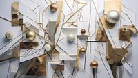 Abstracte compositie met gefragmenteerde geometrische elementen. De compositie is zeer eigentijds in wit- en goudtinten.