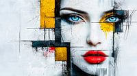 Dit werk combineert fascinerende helderheid met abstracte fragmentatie. Een bijna smetteloos gezicht wordt onderbroken door geometrische structuren en gebarsten oppervlakken, alsof het vanuit een andere dimensie de werkelijkheid binnenkomt. De lichtgevende blauwe ogen vangen de blik van de kijker - ze zijn het centrum, het vaste punt van een wereld die bezig is op te lossen of zichzelf opnieuw te vormen.