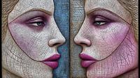 Dit abstracte digitale schilderij toont een spiegelsymmetrisch zijportret van een vrouwenhoofd op een gebarsten oppervlak. De sterke lijnen en contrasterende kleuren geven de esthetiek van breekbaarheid en imperfectie weer. Het symmetrische ontwerp van het portret geeft een zekere harmonie aan de scène, terwijl de barsten in het…