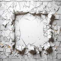 Dit schilderij is een fascinerend spel met het motief van verval, dat zowel een esthetisch als symbolisch niveau raakt. De witte bakstenen muur die als canvas dient lijkt op het eerste gezicht onberispelijk, maar het centrale gedeelte is dramatisch gebroken. Scherpe scheuren en versplinterde panelen, die doen denken aan gebroken glas,…