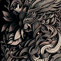 Een zeer gedetailleerde vectorillustratie van een feniks omringd door vloeiende bladeren en sierlijke wervelingen, ontworpen in een gedurfde tattoo-stijl. Met behulp van digitale technieken zoals contourlijnen, precieze arceringen en stippling creëert dit ontwerp rijke diepte en textuur. Tegen een donkere achtergrond steken de…