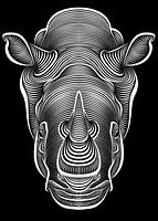 Een gedetailleerd frontaal portret van een neushoornkop gemaakt met nauwkeurig wit lijnwerk op een zwarte achtergrond. Het symmetrische ontwerp maakt gebruik van vloeiende rondingen om de kenmerkende hoorn, oren en gelaatstrekken van het dier te definiëren met betoverende optische effecten.