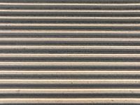 Voorbereide grond voor het planten van gewassen tijdens een zonnige en droge lentedag. Luchtopname met drone van recht boven, waarop het lijnenpatroon in de grond te zien is.