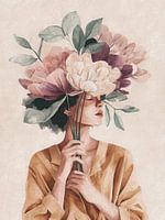 In deze serene aquarel vervagen de grenzen tussen mens en natuur: een vrouw laat haar gezicht deels overnemen door bloeiende bloemen in zachte pastelkleuren. De compositie ademt rust, introspectie en de kracht van natuurlijke schoonheid. Geïnspireerd door minimalisme en botanische illustratie, brengt dit kunstwerk een gevoel van balans en zelfexpressie.
