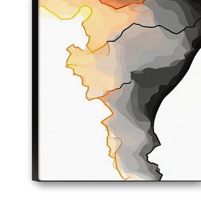 Dit kunstwerk combineert minimalisme en emotionele diepte in een indrukwekkende compositie. Het profiel van een vrouw verschijnt aan de linkerkant van de foto, gemodelleerd uit donkere schaduwen en omgeven door zachte, organische kleurlagen. Deze abstracte kleurvlakken - in grijstinten, warm oranje en koel blauw - lijken op atmosferische rookslierten of wolkachtige gedachteformaties die uit het hoofd van het silhouet oprijzen.