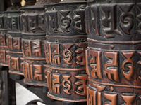 Gedecoreerde messing boeddhistische gebedswielen in het heiligdom Swayambhunath, een stupa tempel in Kathmandu, de hoofdstad van Nepal.