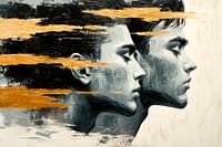 Profielen van een stel in een abstracte omgeving. De getextureerde penseelstreken geven de afbeelding een driedimensionale diepte en dynamiek die het oog van de kijker gevangen houdt. Gouden accenten zorgen voor een luxueuze en elegante toets. Dit werk is perfect voor moderne interieurs die op zoek zijn naar een combinatie van hedendaagse esthetiek en diepe symboliek. Het spreekt zowel het oog als de geest aan en nodigt de kijker uit om de diepere betekenis en subtiele details te verkennen. Een ideaal stuk voor kunstliefhebbers die iets speciaals waarderen. De unieke gezichten zijn gemaakt in samenwerking met innovatieve AI.