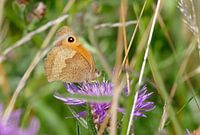 Een "Bruine bosvogel" strijkt neer op een weidekruid