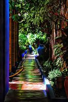 Een loopbrug met schaduw om te schuilen voor de hete zon in Marrakech, Marokko. Dit is in de Jardin Majorelle, een botanische tuin vol exotische planten en kleurrijke potten en beschilderde muren. Zoals altijd toont dit beeld mijn fascinatie voor de wisselwerking tussen licht en schaduw.