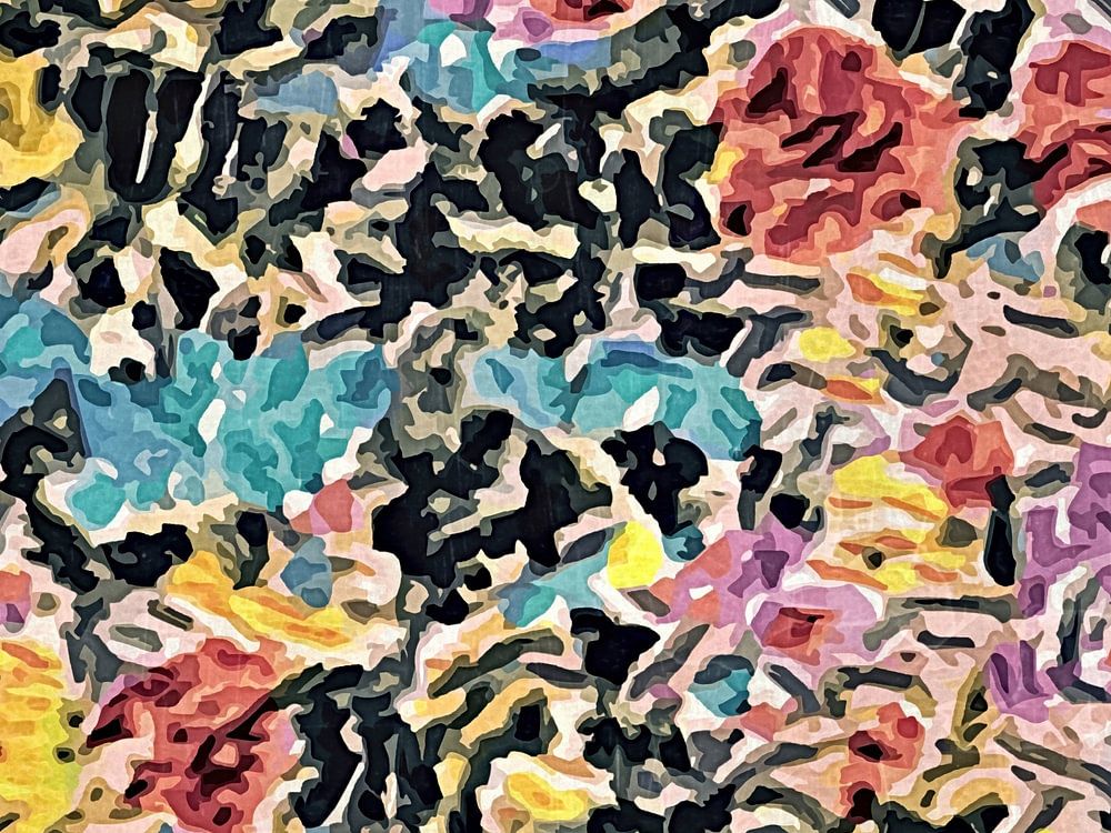 Een abstract expressionistische impressie van gedempte vrolijkheid. Maar je kunt er van alles en nog wat in zien. Wat van wilde rozen in allerlei kleuren groeiend in vruchtbare kleigrond? De rode, roze, blauwe en gele tinten tegen de donkere achtergrond zouden inderdaad zomaar een een veld met wilde planten kunnen zijn die zich…