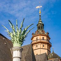 De gedenkzuil en de kerktoren van de Nikolaikerk in het centrum van Leipzig, Saksen, Duitsland.