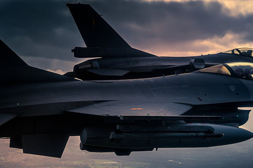Gedetailleerde close-up beelden van F-16 gevechtsvliegtuigen.