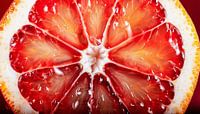 Gedetailleerde close-up van een plakje verse bloedsinaasappel met druppels