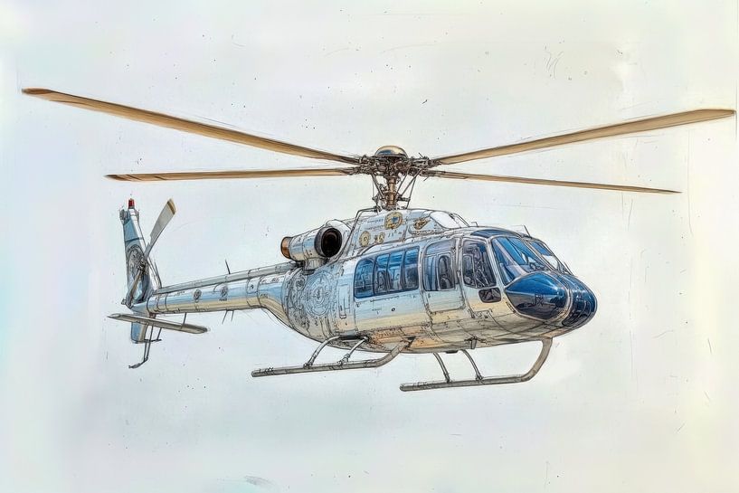 Gedetailleerde tekening van een helikopter in vlucht. De helikopter heeft een realistische weergave. De kleuren zijn voornamelijk wit en blauw. De cockpit is duidelijk zichtbaar. De tekening is technisch en nauwkeurig. Mooi in een industriële woonstijl vanwege de technische en mechanische details. Ook mooi in een moderne ruimte zoals een kantoor, studeerkamer, of een woonkamer met een minimalistisch of strak interieur.