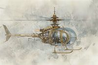 Gedetailleerde tekening van een helikopter . De helikopter heeft een retro-futuristisch ontwerp met veel mechanische onderdelen en tandwielen zichtbaar in de constructie. Het frame van de helikopter is versierd met ingewikkelde patronen en lijkt gemaakt te zijn van messing of een soortgelijk metaal. De cockpit is bolvormig en transparant, waardoor de binnenkant van de helikopter goed zichtbaar is. De achtergrond bevat vage, schetsmatige tandwielen en mechanische elementen, wat bijdraagt aan de steampunk-esthetiek.