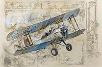 Gedetailleerde tekening van een vintage dubbeldekker vliegtuig, uit de vroege 20e eeuw. De achtergrond bestaat uit technische tekeningen en schetsen van verschillende mechanische onderdelen en architecturale elementen, om de tekening een technische en historische sfeer te geven. De kleuren in de tekening zijn voornamelijk zachte tinten van blauw, bruin, grijs en beige, met enkele accenten van rood en oranje in de motor van het vliegtuig.
