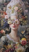 Als verhaal voel je hier twee thema’s samenvloeien: de menselijke verschijning die zich verliest in verbeelding, en de stille pracht van natuurproducten die als attributen fungeren. Het is een vrouw schilderij en een bloemen schilderij en een fruit schilderijtegelijk—eenportretschilderijdatgeenduidelijkgezichtaanbiedtmaarwelheelduidelijkpresenteertwathaaromringt.Jehoortbijnahetzachteritselenvanbladeren,ruiktdezoetheidvandruivenenvoeltderondevormenvangranaatappelpitteninjehanden.Datspeltussenzichtensensatieisprecieswaaromdebloemenblinddoekendefruit-hoedzoovertuigen:zemakenvaneenportreteenervaring.