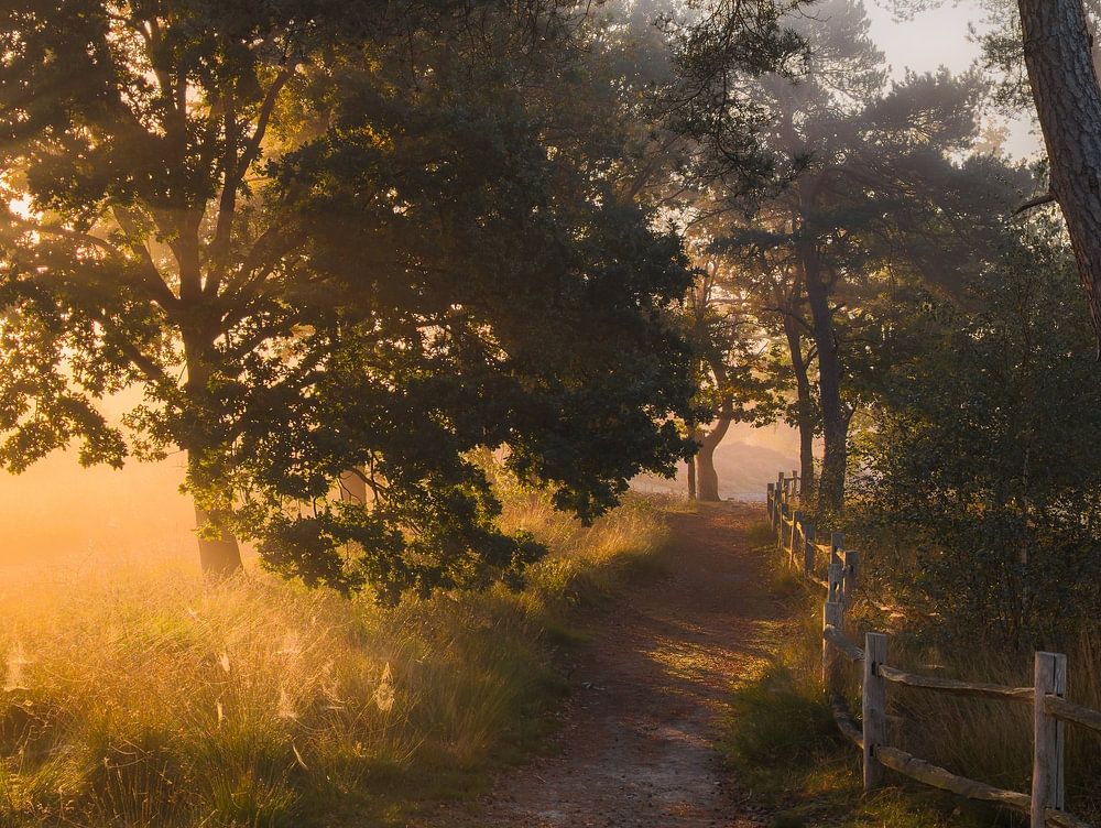 Een gouden zonsopgang schijnt door de bomen en werpt hemelse stralen over een rustig bospad.