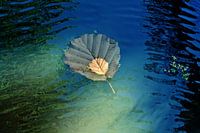 Een herfstblad drijvend op het water, gedragen door een groter blad door digitaal bewerking. Het symboliseert stilte, uitvaart, leegte, steun bij verlies.