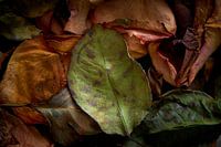 Gedroogde bladeren van een roos. Zowel de bladeren van de kroon, de kelk en de bladeren aan de bloemstengel, vormen samen een palet van verschillende pasteltinten.