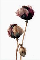 “Gedroogde Papavers in Zachte Waas” is een sfeervol abstract kunstwerk waarin twee gedroogde papaverbloemen op delicate wijze naar voren komen uit een heldere, witte achtergrond. De losse penseelstreken en subtiele ink-wash effecten geven het werk een organische, licht vervaagde uitstraling.