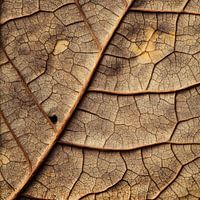 De filigrane nerven van de bladeren vertellen verhalen van vervlogen tijden. Hun fragiele oppervlak, een fascinerend samenspel van goud- en bruintinten, lijkt op de dunne huid van een oude landkaart. Elke barst en elke kleuring geeft de compositie een vleugje nostalgie en schoonheid die de vergankelijkheid van de natuur kunstig weerspiegelt.