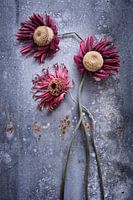 Compositie van 3 grillige en vergane gerbera's op een verweerde zinken ondergrond