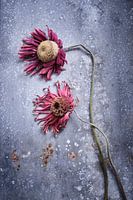 Compositie van 2 grillige en vergane gerbera's op een verweerde zinken ondergrond