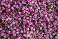 Gedroogde roosjes op een markt in Marokko. Ze worden gebruikt voor rozenwater en kleurstoffen.