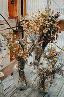 Tere boeketten van gedroogde veldbloemen (o.a. kamille) staan in glazen weckpotten op een verweerde houten tafel. Het diffuus licht van geribd kasglas en de natuurlijke patina geven dit stilleven een kalme, wabi-sabi sfeer. Botanische fotografie die warmte en “slow living” toevoegt aan keuken, woonkamer, studio of café.