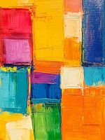 Dit kunstwerk combineert heldere kleurvlakken in rood, blauw en geel, gerangschikt in een duidelijke geometrische structuur. De penseelstreken voegen diepte toe aan de blokken, waardoor een levendige compositie ontstaat die visueel aantrekkelijk is en energie geeft. De combinatie van strakke lijnen en gedurfde kleuren maakt dit werk tot een ideaal middelpunt voor moderne interieurs.