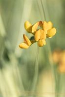 Macrofoto van Moerasrolklaver, een mooie kleine gele wilde bloem. De achtergrond is zacht en onscherp en slechts een klein deel van de bloem is perfect scherp zodat de bloem uit de foto springt. De foto heeft een dromerige kleurige en zomerse sfeer.