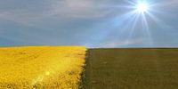 Koolzaad veld en grasland, naast elkaar. Met een mooie zon erboven zorgt het voor een heerlijk voorjaarsgevoel.