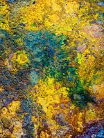 Foto van een roestig metalen oppervlak, maar het zou ook een rotsachtig landschap kunnen zijn vanaf grote hoogte gezien, begroeid met bos en met gebieden vol water, maar de landschapsstructuren zijn een toevallige illusie. Het blijft roest, dat dit beeld heeft gevormd door de kleurwaarden lichtjes te veranderen (vergelijkbaar met een topografische kaart).