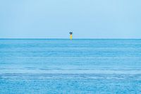 Minimalistisch landschap met geel geschilderd baken in de Waddenzee voorzien van zonnepanelen voor de energievoorziening van de lichten.