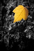 Koop de foto Geel herfstblad tegen een zwarte achtergrond van Chi als print op canvas, aluminium dibond, (ingelijste) fotoprint, behang en ArtFrame. Voor jou op maat geprint in Fine-Art kwaliteit.