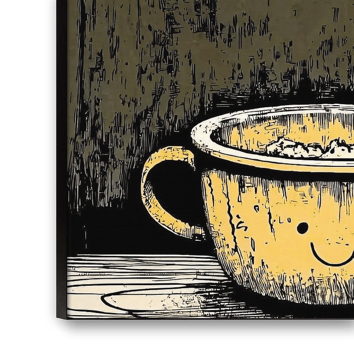 Een sfeervol en minimalistisch kunstwerk dat perfect past in een gezellige keuken of eetkamer. Dit ontwerp toont een eenvoudig geel kopje met een vriendelijke glimlach en een lepel, afgebeeld tegen een rustieke achtergrond. Het gebruik van warme tinten zoals sepia en geel geeft een uitnodigende sfeer aan het geheel. Ideaal als wanddecoratie om een subtiele en charmante uitstraling aan je interieur toe te voegen. Dit kunstwerk brengt een speelse en knusse vibe die zeker een glimlach op je gezicht tovert. Perfect als cadeau of als eyecatcher in je eigen huis.