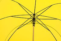 De onderkant van een gele paraplu met zwarte lijnen van het binnenwerk.