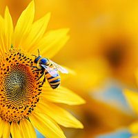 Een uitgestrekt geel natuurlandschap met een zee van zonnebloemen die trots in de zon staan. De felgele bloemen reiken naar de hemel, terwijl een zacht briesje de bladeren doet ritselen. De zon straalt helder over het veld, en de foto is een spel van intens blauw en geel, wat het vredige tafereel compleet maakt.