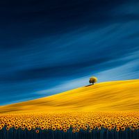 Een uitgestrekt geel natuurlandschap met een zee van zonnebloemen die trots in de zon staan. De felgele bloemen reiken naar de hemel, terwijl een zacht briesje de bladeren doet ritselen. De zon straalt helder over het veld, en de foto is een spel van intens blauw en geel, wat het vredige tafereel compleet maakt.