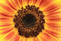 Beeldvullende macro van het centrale deel van de bloem.De rood,oranje en geel gekleurde blaadjes leiden het oog naar het centrale deel van de bloem.