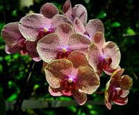 Deze geel-rode orchidee (Phalaenopsis) is op 6 mei 2024 gefotografeerd in de orchideeëntuin van ‘Vizcaya Museum and Gardens’ in Miami, Florida.