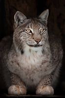 Geel-rode slanke lynx kijkt neer vanuit de duisternis met heldere ogen