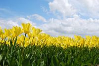 Detail van een veld met gele tulpen onder een blauwe lucht met witte wolken.