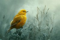 Een krachtig contrast komt tot leven in dit kunstwerk, waar een klein geel vogeltje zit op een takje in een mistige, koude ochtend. De atmosfeer ademt een ijzige kalmte uit, waar de lucht gehuld is in een intens blauwgroene gloed. De kou lijkt tastbaar, elk element van het beeld draagt bij aan de kilte van de ochtend, behalve het levendige geel van het vogeltje dat zich aftekent als een stralend zonnetje.