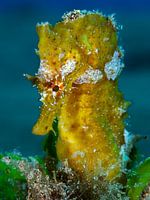 Een prachtig geel zeepaardje dat tijdens een duik in de Atlantische Oceaan rond het Canarische Eiland Lanzarote is gezien. Het geel van het zeepaardje contrasteert sterk met de diep blauwe achtergrond, het zeepaardjes spat er vanaf!