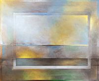 Door een raamwerk van kleuren kijk je naar de horizon. Binnen en buiten lijken onduidelijk. De ruimte lijkt binnen te komen. Die gelaagdheid geeft diepte en stilte.