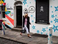 Deze foto legt een onverwachte en luchtige ontmoeting vast in de straten van Dublin, waar humor en straatkunst naadloos samensmelten met het dagelijks leven. Terwijl een vrouw langs een café loopt, zorgt de langzame sluitertijd voor een subtiele motion blur, waardoor haar beweging vluchtig en haast gehaast oogt. Precies op dat moment…