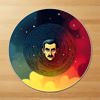 In het midden van een wervelend spectrum verschijnt een eenzame geest uit een complexe draaikolk van lijnen en kleuren. Het cirkelvormige ontwerp doet zowel denken aan een kosmische kaart als aan de groeven van een grammofoonplaat – een verwijzing naar het feit dat ideeën als frequenties naar buiten uitstralen in het universum. Het…