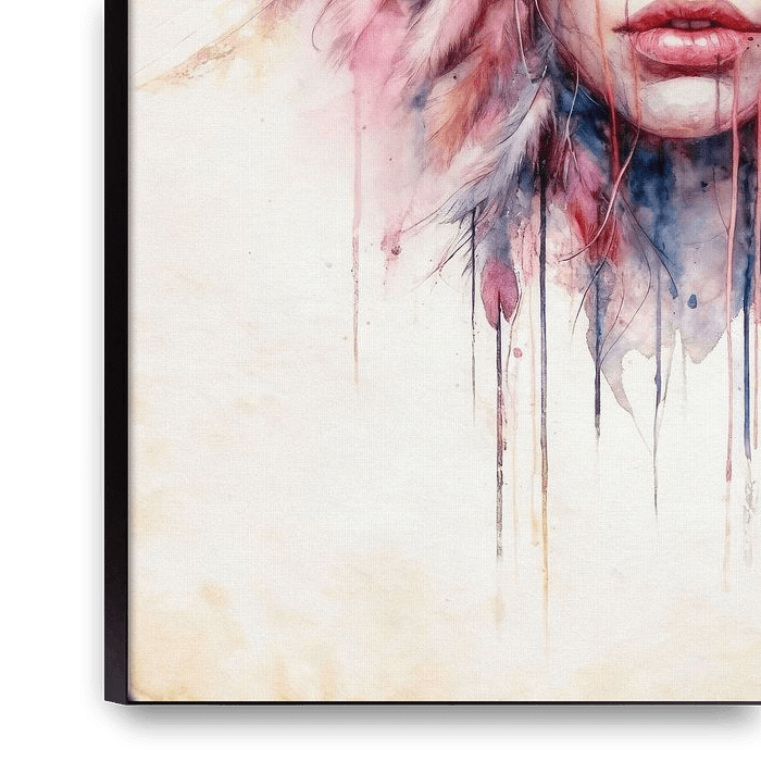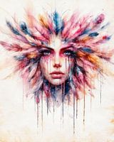 Deze hoogwaardige kunstdruk toont een eigentijds aquarelportret van een vrouw met kunstig gerangschikte veren. De combinatie van moderne portretkunst, intense kleuren en abstracte elementen maakt dit motief bijzonder populair bij liefhebbers van moderne muurkunst, fine art prints en expressieve illustraties.